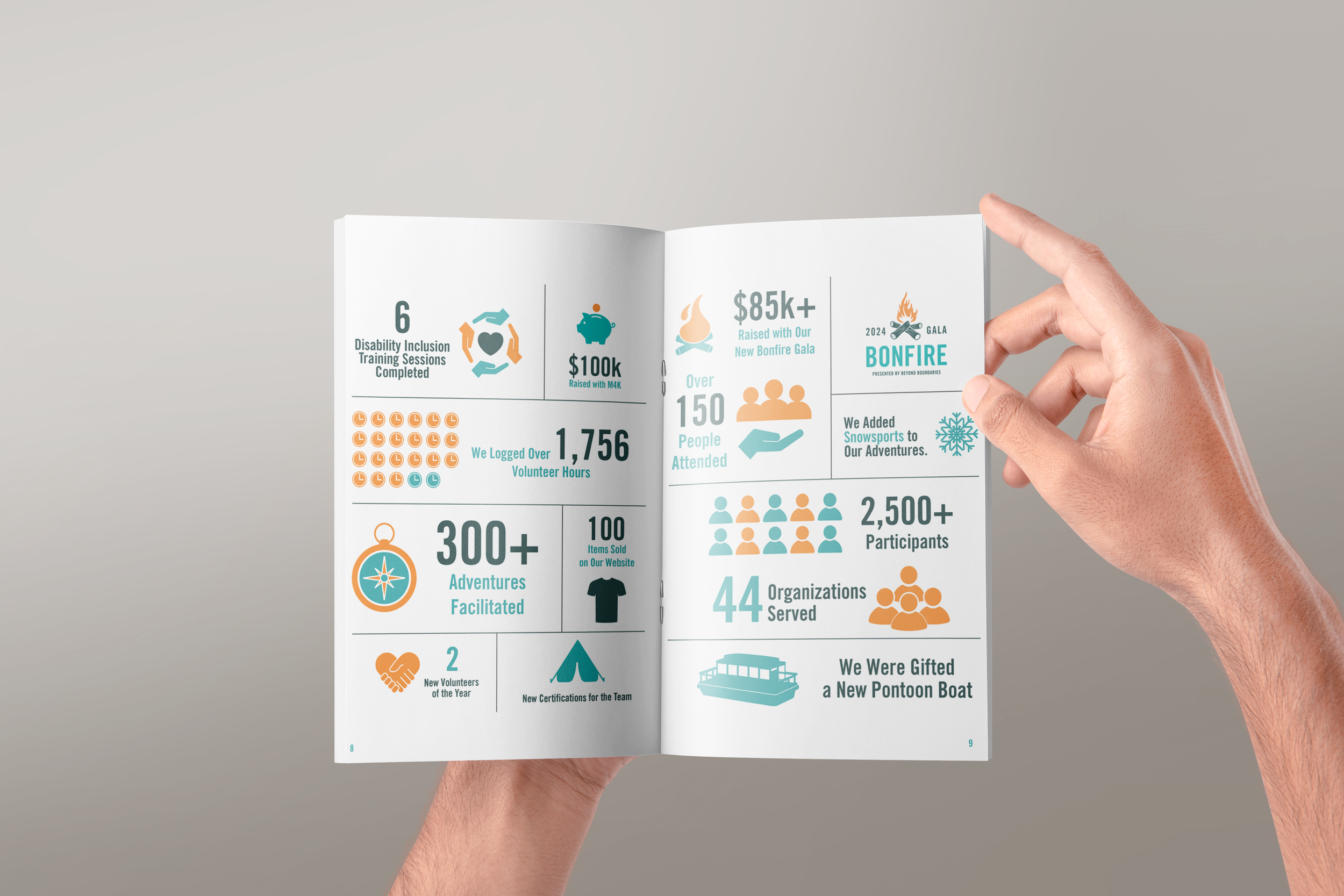 Tasked with designing he Beyond Boundaries Impact Report, I wanted to showcase their mission of making outdoor adventure accessible to people of all abilities and backgrounds. Beyond Boundaries believes that the more we adventure together, the stronger our community becomes—and I wanted the report to reflect that inclusive spirit. Through clean layouts, bold visuals, and storytelling-driven design, the report highlights the organization’s accomplishments and the meaningful impact of their programs.