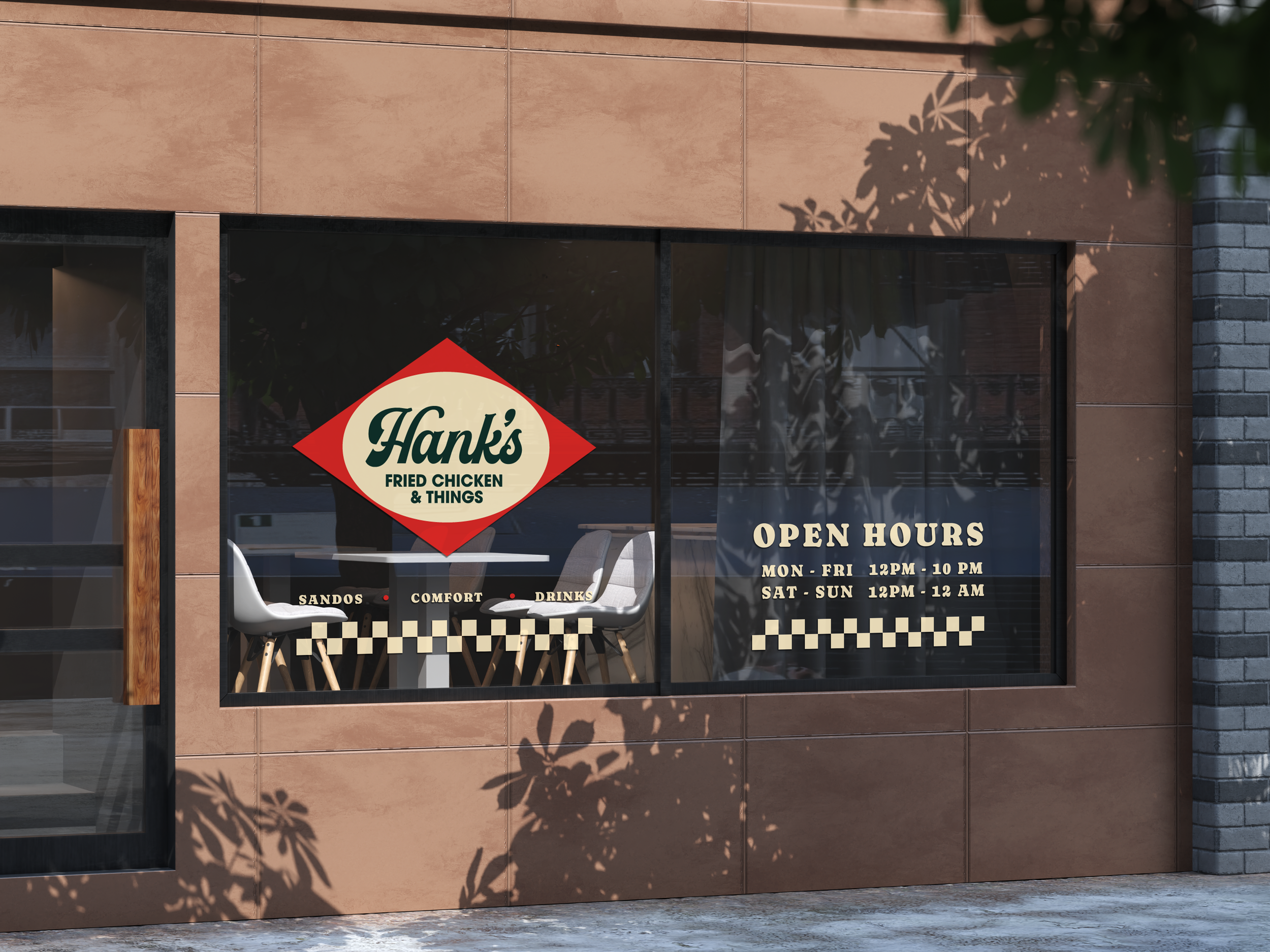 Hank’s Fried Chicken is a community-driven restaurant rooted in familiarity, comfort, and approachability; qualities that are reflected throughout its logo. The bold diamond shape and warm color palette evoke a sense of tradition and neighborhood charm, while the hand-drawn script conveys friendliness and authenticity. Together, these elements create a welcoming mark that feels established and trustworthy, reinforcing Hank’s role as a reliable gathering place for good food and good company.